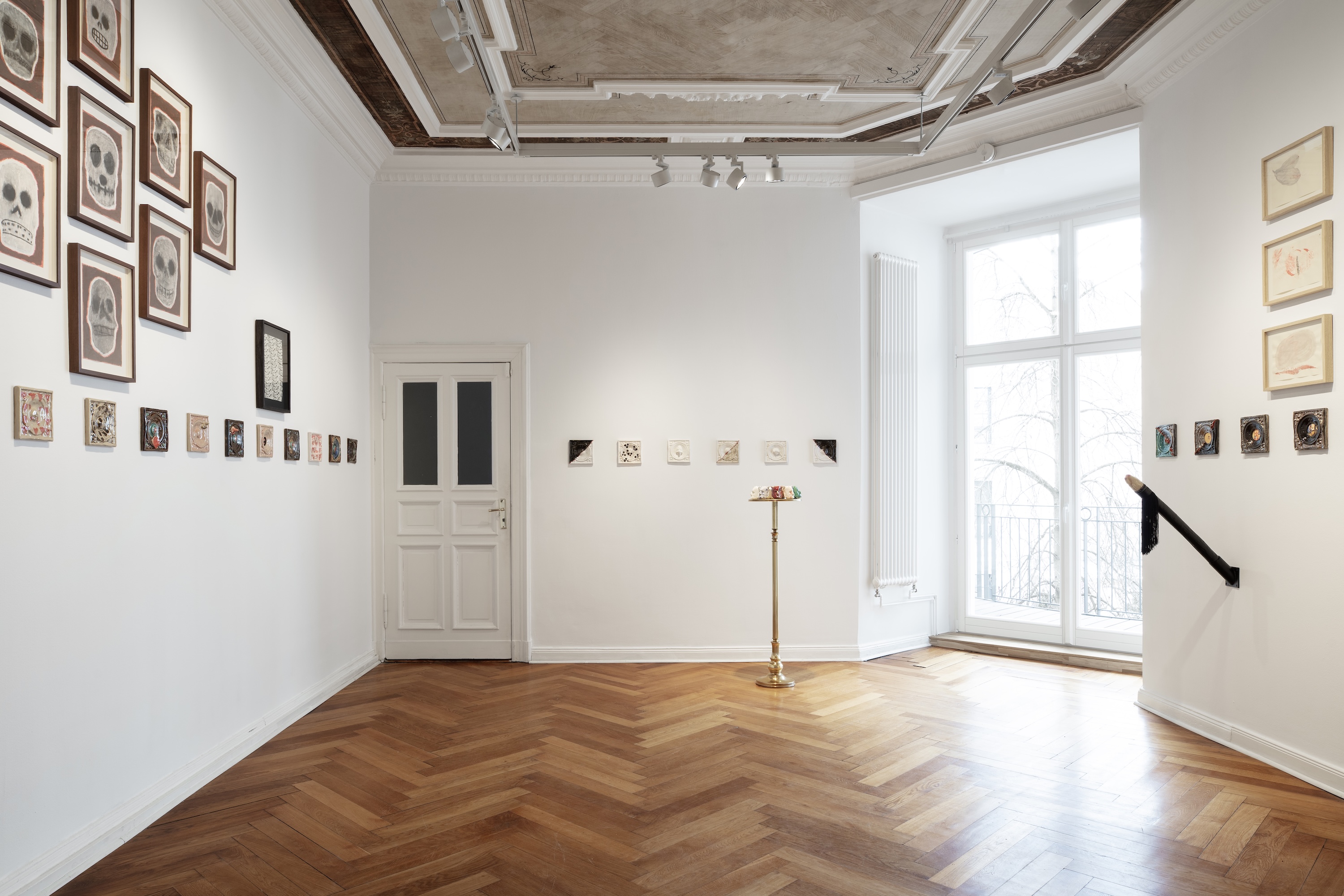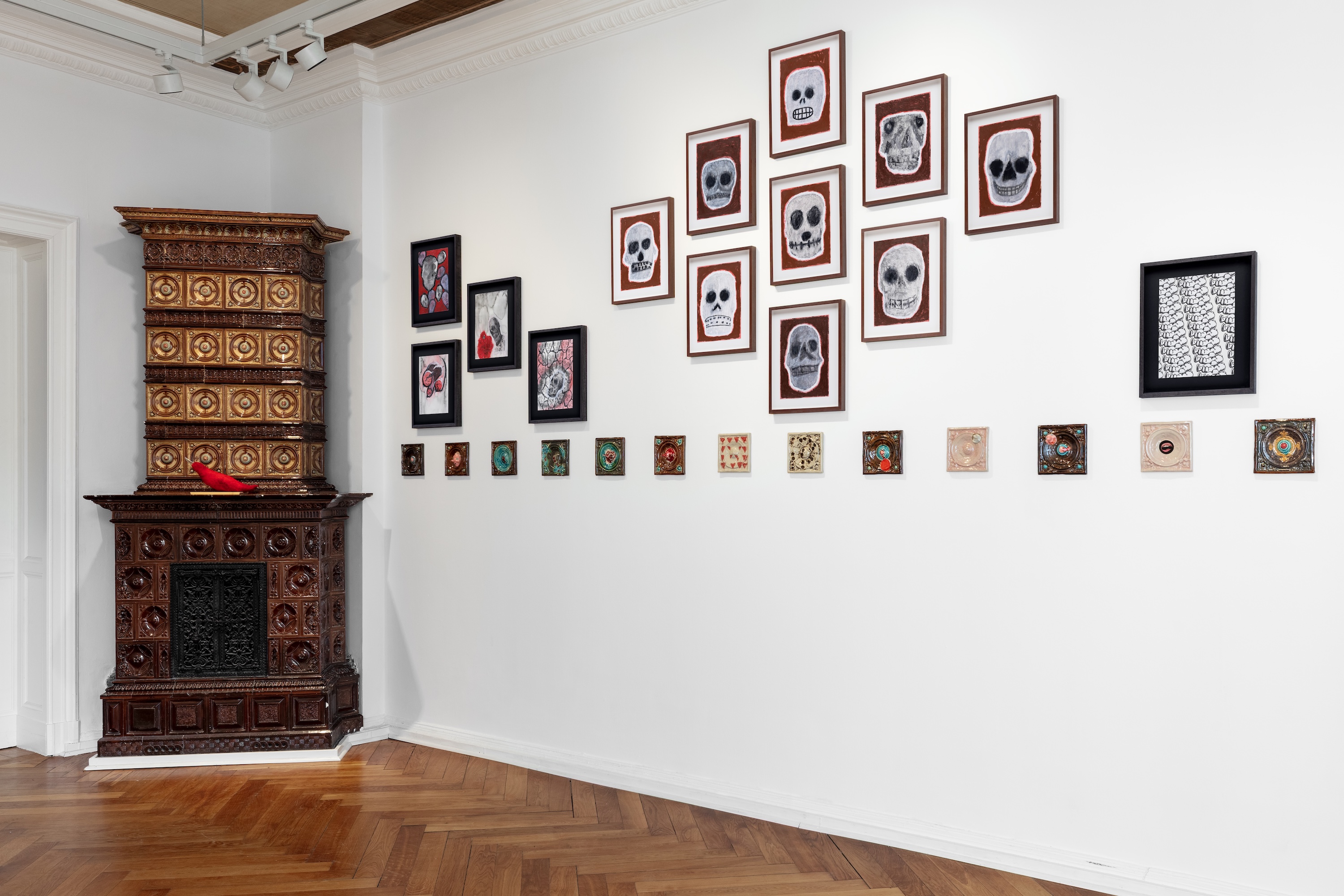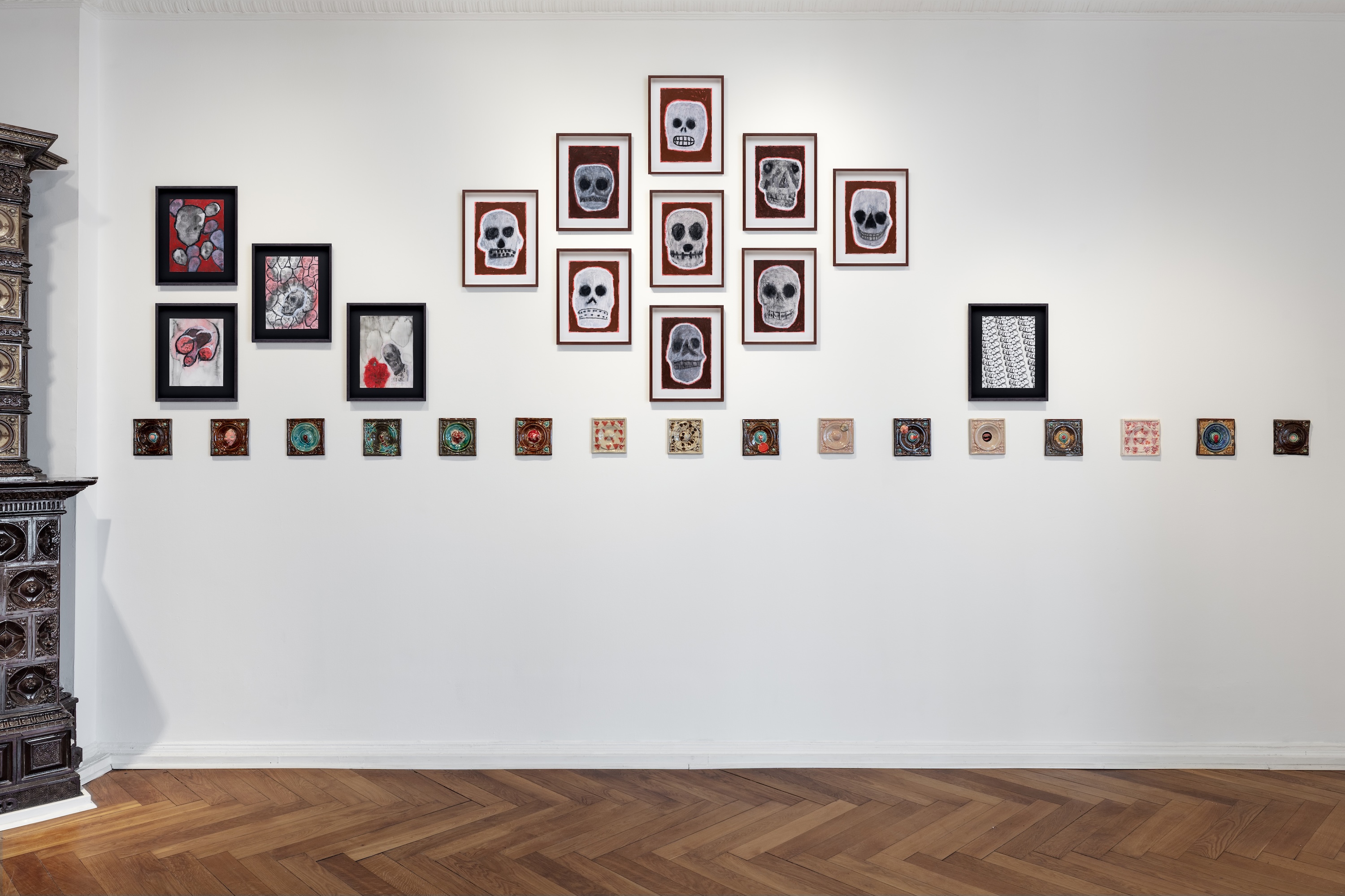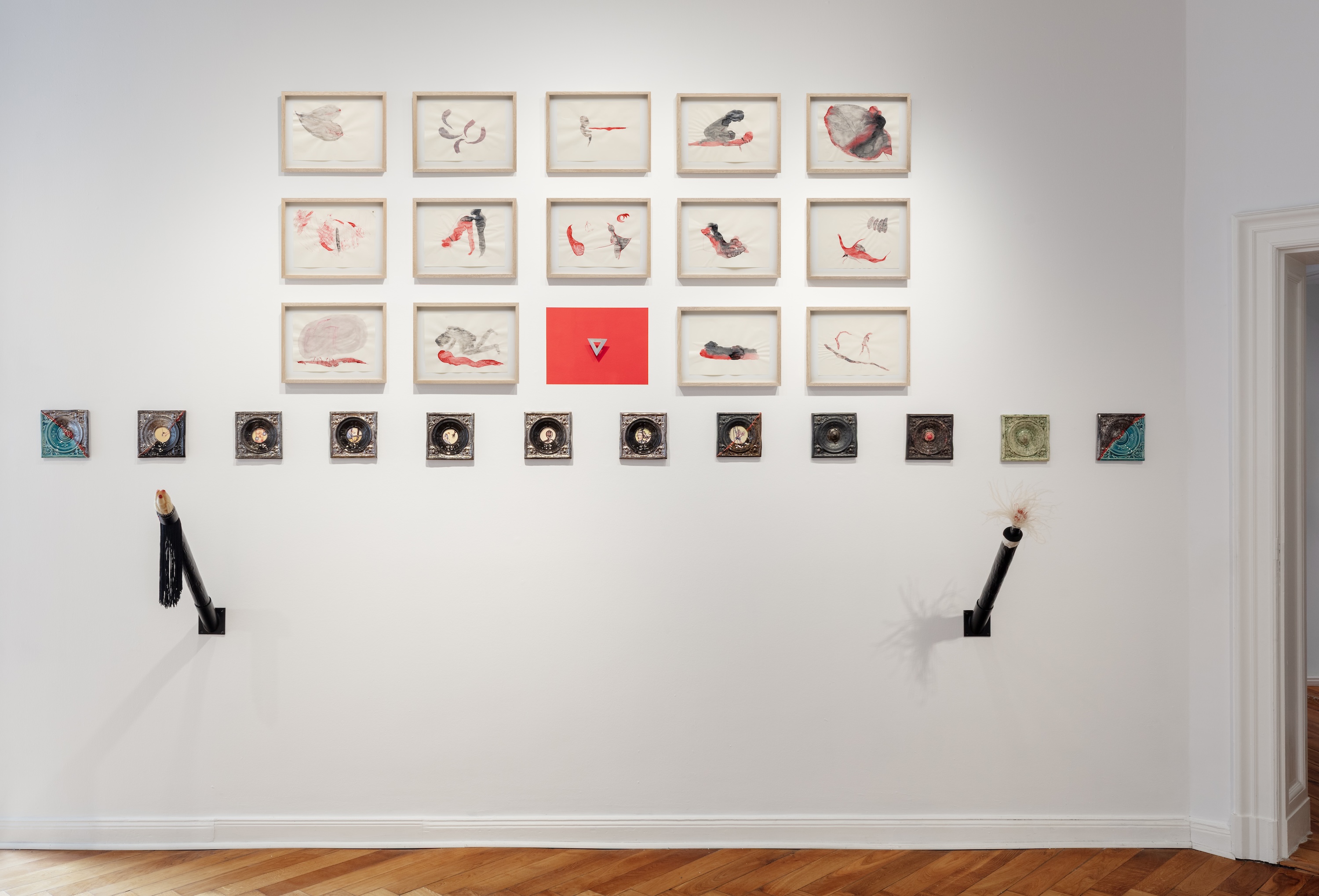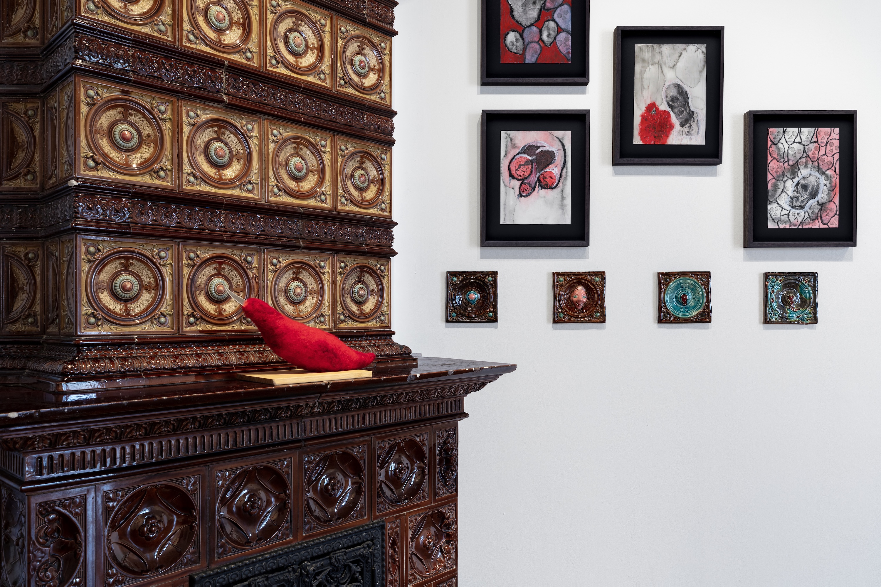 Öztat uses the bourgeois setting of the gallery – the parquet floors, stucco wall ornamentation, and brown tile stove of an old-Berlin building – as starting point. The tile stove is both a functional object and bearer of a decorative surface. In a site-specific body of work, İz Öztat engages with this decorative surface by recasting one of the tiles and exhaustively reinterpreating it. In some tiles, Öztat leaves the casting seams, usually sanded off by the artisan, visible, and thus infringes on the standard of a smooth, flawless façade. The devil is in the detail: in minute cracks, visible casting seams, a pair of devil’s horns jutting out. In other tiles, peep-holes appear, which – like the series of watercolors titled Surrender exhibited next to them – reveal fragmentary views of bodies in bondage and broken skin and thus encourage a playful interaction between desire, pain and control, as counter-image to the bourgeois rigidity of a voyeuristic gaze constrained within a strictly regulated moral regime.