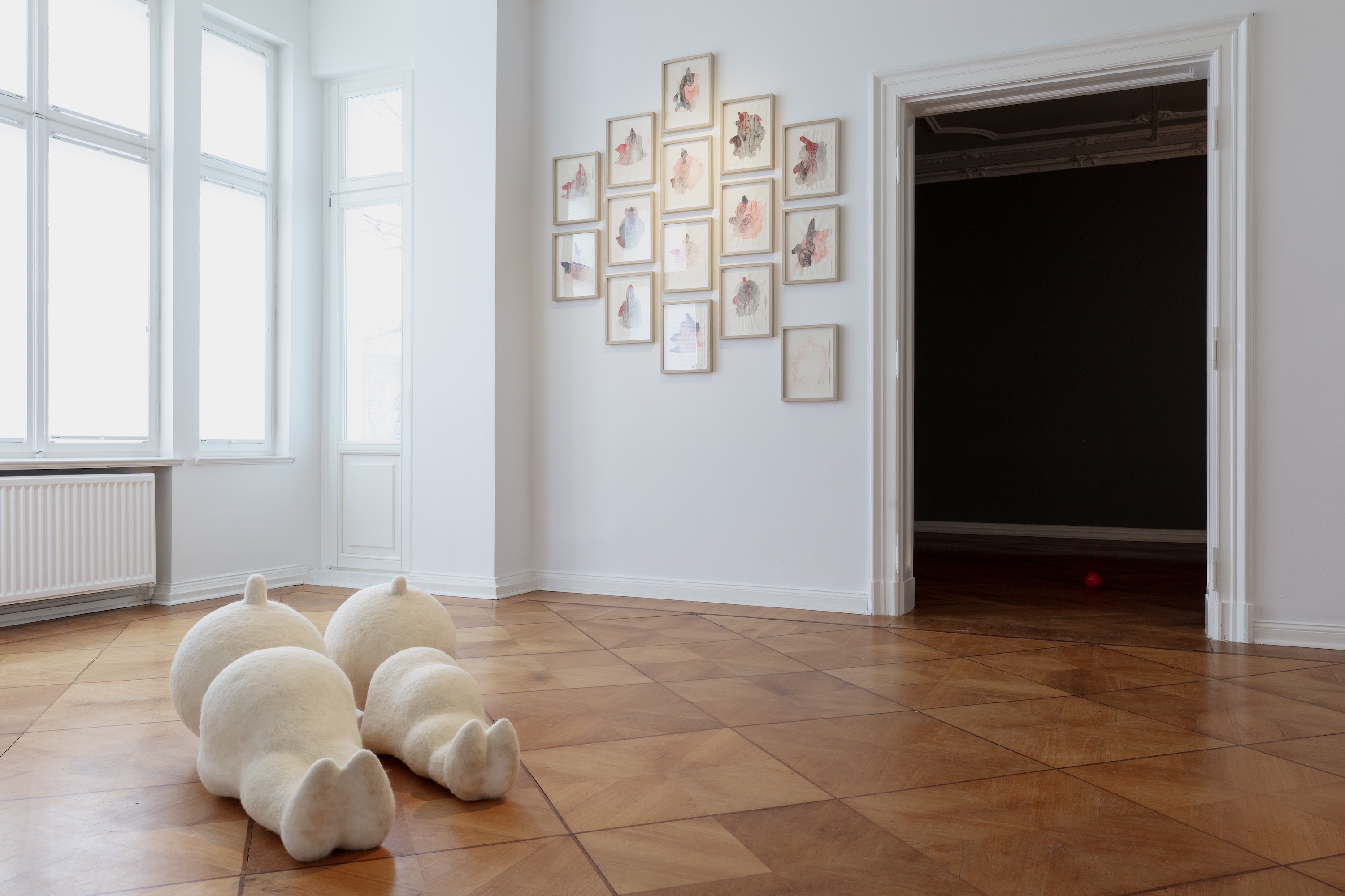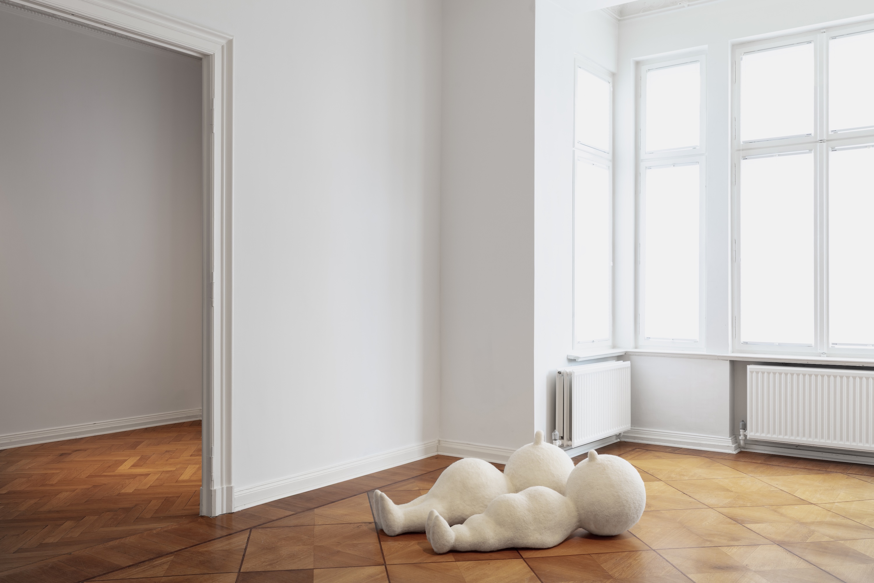 İz Öztat’s title cites the sentence with which Wilhelm Busch ends his graphic story Max and Moritz, a German classic from 1865. The exhibition includes an identically titled sculpture, which shows the two naughty boys lying next to each other, covered in felt shrouds – citing the penultimate scene from the book, where they are wrapped in bread dough and put in the oven, a precursor to their bitter end after one more prank. Finally, order is restored, punishment is meted out: Max and Moritz are ground in the mill and fed to the ducks: “Now we’re done with evil-doing.” And “when all saw the fate they’d met, the villagers felt no regret.” Max and Moritz was originally meant not as a tale for children, but rather as satirical parody, revealing the cold, harsh ethics of an authoritarian society, as well as the moral double standards applying to disobedience and punishment. İz Öztat pursues Busch’s line of harsh social criticism.