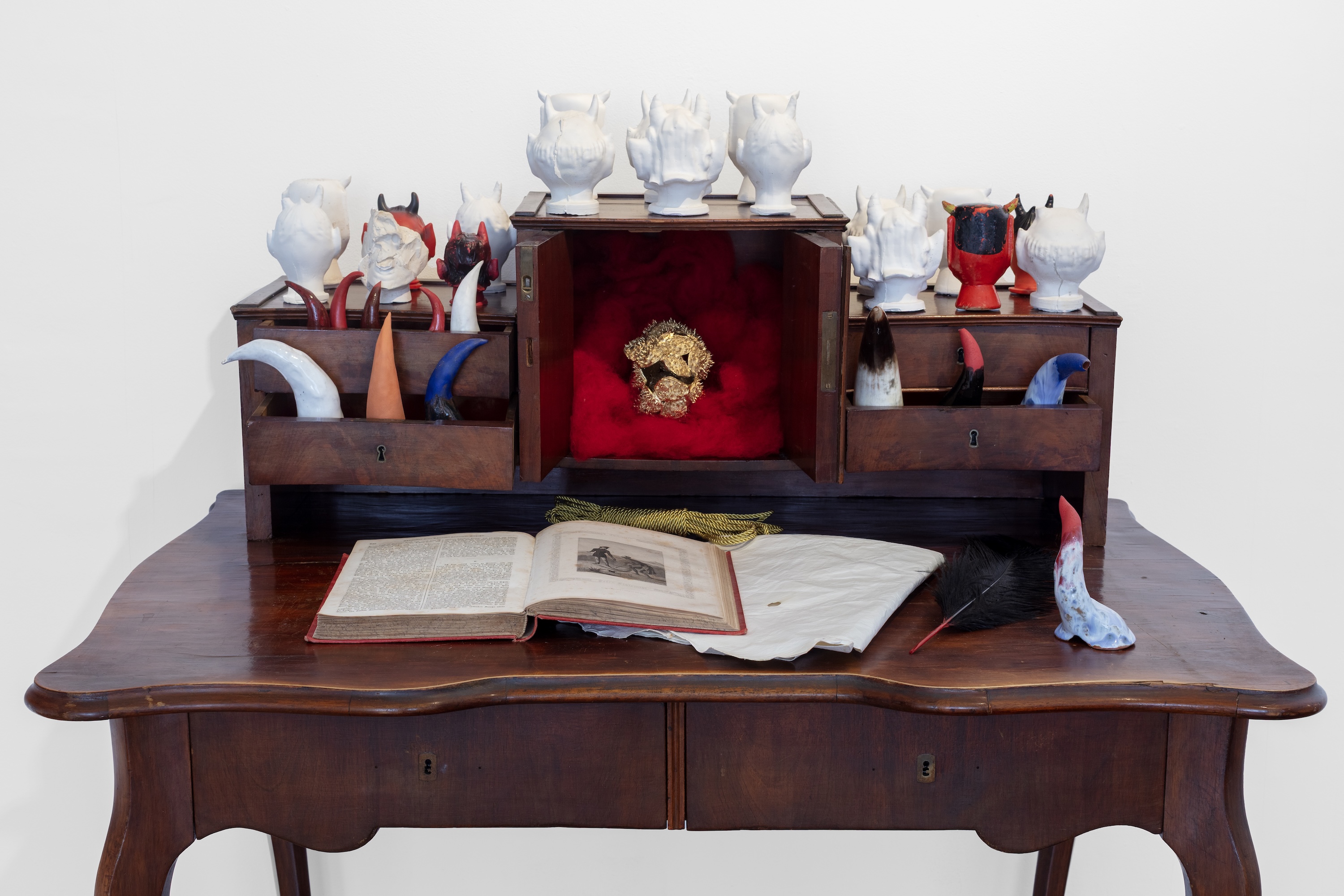 In her exhibition, Öztat picks up on the ambivalence laid out by Busch and adds to it other German-language narrative topoi drawn from the Kasperle puppet theatre and the Faust legend, with its theme of a pact with the devil. Here, too, the ostensible lesson is not unambiguous; it depends on who is perceived as evil-doer and who as victim, and whom the reader identifies with. Rather than morally neutralizing the violence inherent in these stories, Öztat uses the traditional narrative material and themes to investigate how they are anchored in collective memory, co-opted by national ideologies, and continue to shape norms and modes of conduct in the present day. In so doing, she raises questions about artistic agency and complicity, obedience and disobedience, as well as demonization and punishment.
