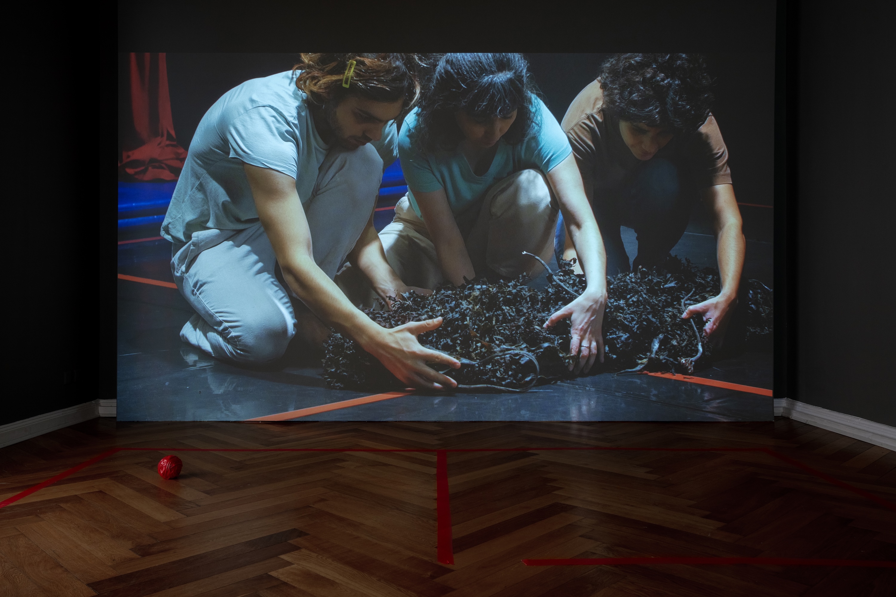 Öztat pursues the issue of repression and return in her video installation Rest (2024). Red tape marks, in the video as in space, borders, zones, and transitions. It makes reference to the staking out of territories, to inclusion and exclusion, to the regulation of movement and the room for maneuver. With terse but weighty artistic means, the work rehearses an allegory of nation building and the exercise of power: the drawing of artificial lines, the top-down enforcement of authority, and submission – but also resistance, mobilization, and the demand for justice. In collaboration with the performers Selim Cizdan, Yeşim Coşkun, Gökçe “CheChe” Gürçay, Leyla Postalcıoğlu, Ra, Mihran Tomasyan and Aslıhan Tuna, Öztat works in a consciously defined Black Box – a protected internal space, to which she moves her work when the public space is increasingly restricted or oppressively regulated.