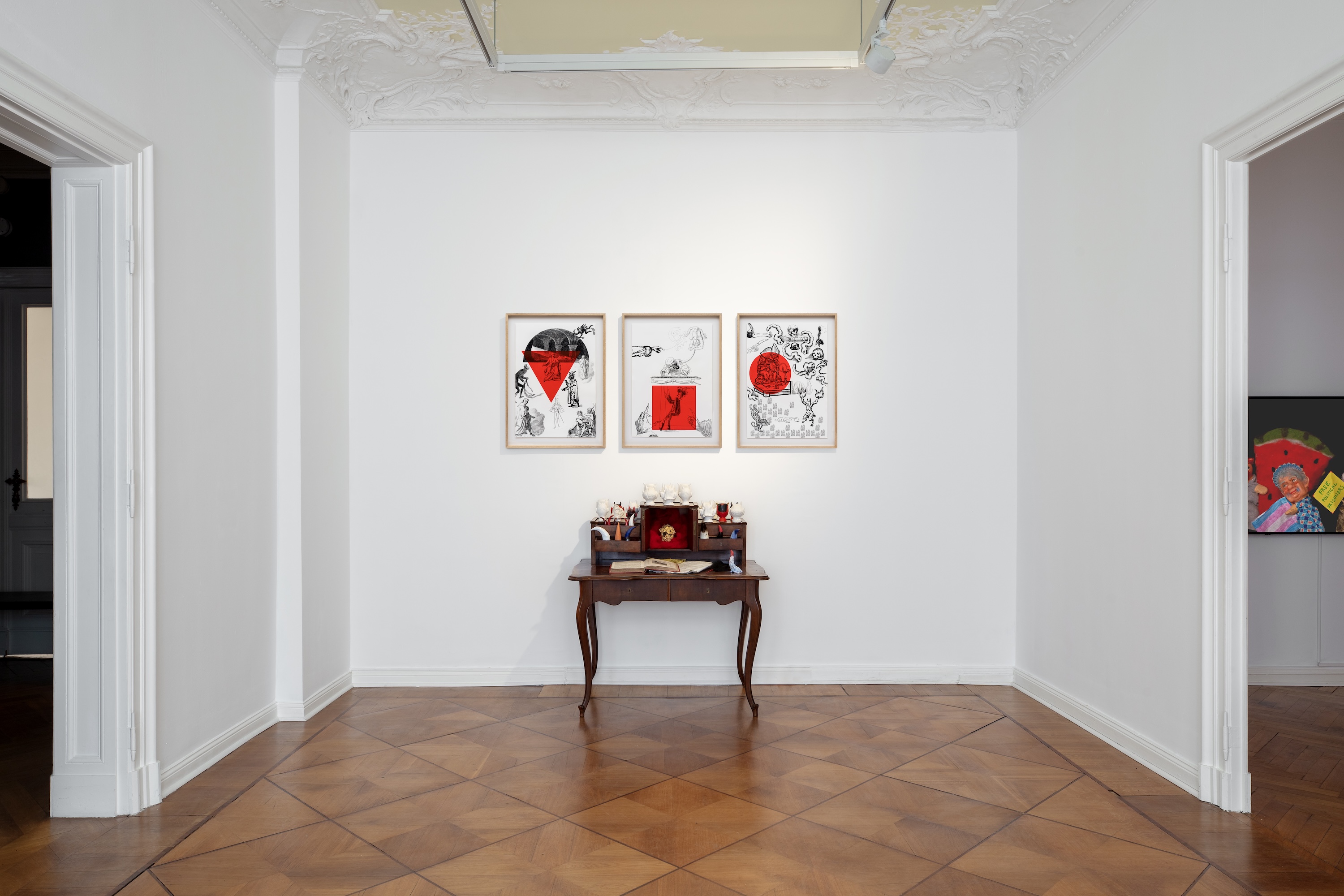 The bourgeois setting of the exhibition leads into a study. An old writing-desk evokes a space of knowledge production and seduction, in which power, desire, and cognition are interlocked. The triptych Studies for Faustian Bargain (2026) draws upon historical engravings and wood-cuts on the Faust legend, in particular illustrations to Goethe’s Faust. The various panels show the scholar in his study, as well as Mephisto, devils, and other allegorical motifs. Various hands intervene in the scenes – pointing, seducing, directing – as in a theatre of marionettes, thus representing Faust’s actions as directed from above and without agency. Faust moves between a thirst for knowledge, a vulnerability to influence, and abettal. Characteristic of a particular iconography that İz Öztat has developed over the years, red geometric forms appear. They establish viewing axes, allow for political associations, and frame Faust as a figure with limited leeway for discretion.