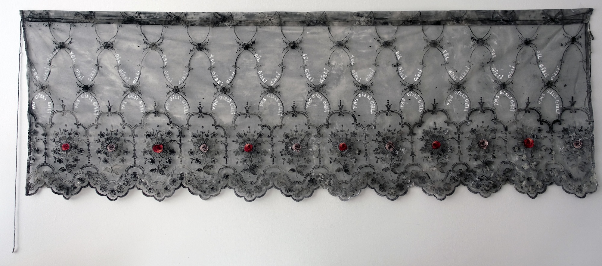 Printed on one of the tulle fabrics, we can read: “sel gizli gizli, yol gizli gizli, dil gizli gizli” (secret is the flood, secret is the path, secret is the language). The words are borrowed from the folk song Gönül Dağı by Neşet Ertaş (1938–2012), a central figure of the Anatolian Abdal musician tradition, which is closely connected to Alevi-Bektashi poetry and music. Polat has added the words “yas gizli gizli” (“secret, secret is the lamentation”). The recurring rhythm of gizli – “secret” – evokes what is concealed and not expressed, an element characteristic of Polat’s work. Here, too, what is concealed is not unveiled; rather, it just shines through – as a light echo of pain, memory, and tenderness.
