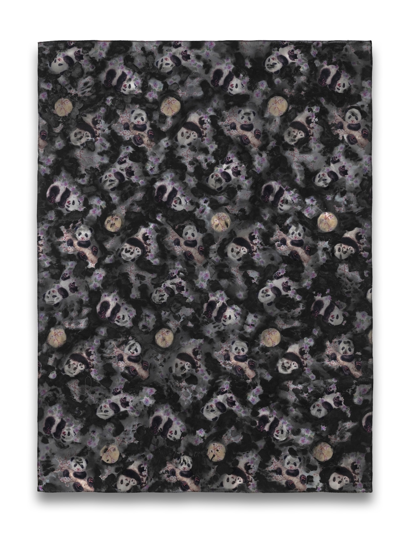 Many of the fabrics that Polat employs in Groundless come from markets – they are industrially manufactured, globally distributed materials, which promise comfort and happiness and thus betray their own emptiness. By sewing, painting over, and darkening them, Polat transforms them into vessels of lived experience. The process of darkening, as the artist says, also involves revealing. In works like O Freedom or Open Visit, overpainted grid patterns recall windows, but also cells – images of isolation, but also of togetherness: every square stands alone, yet is linked in the whole. Other works refer to ecological and economic crises. In Döşemelik, a nearly five-meter-long black-painted ribbon of fabric unfurls from the wall into the room – an image for the sinking of the ground, for the loss of stability and of the basis of our livelihoods. In Kırık, Polat translates the veins of a marbled fabric into dark lines: aridity, cracks, the traces of an earth that threatens to disintegrate. The images of drought, water scarcity, forest fires, and earthquakes stand for a landscape in a state of emergency. A Fall of the Net Bag and Two Handkerchiefs draw upon commonplace materials – shopping nets, handkerchiefs, everyday textiles. They evoke economic inequalities, human intimacy, and crises of supplies. They bear the traces of quiet forms of resistance.