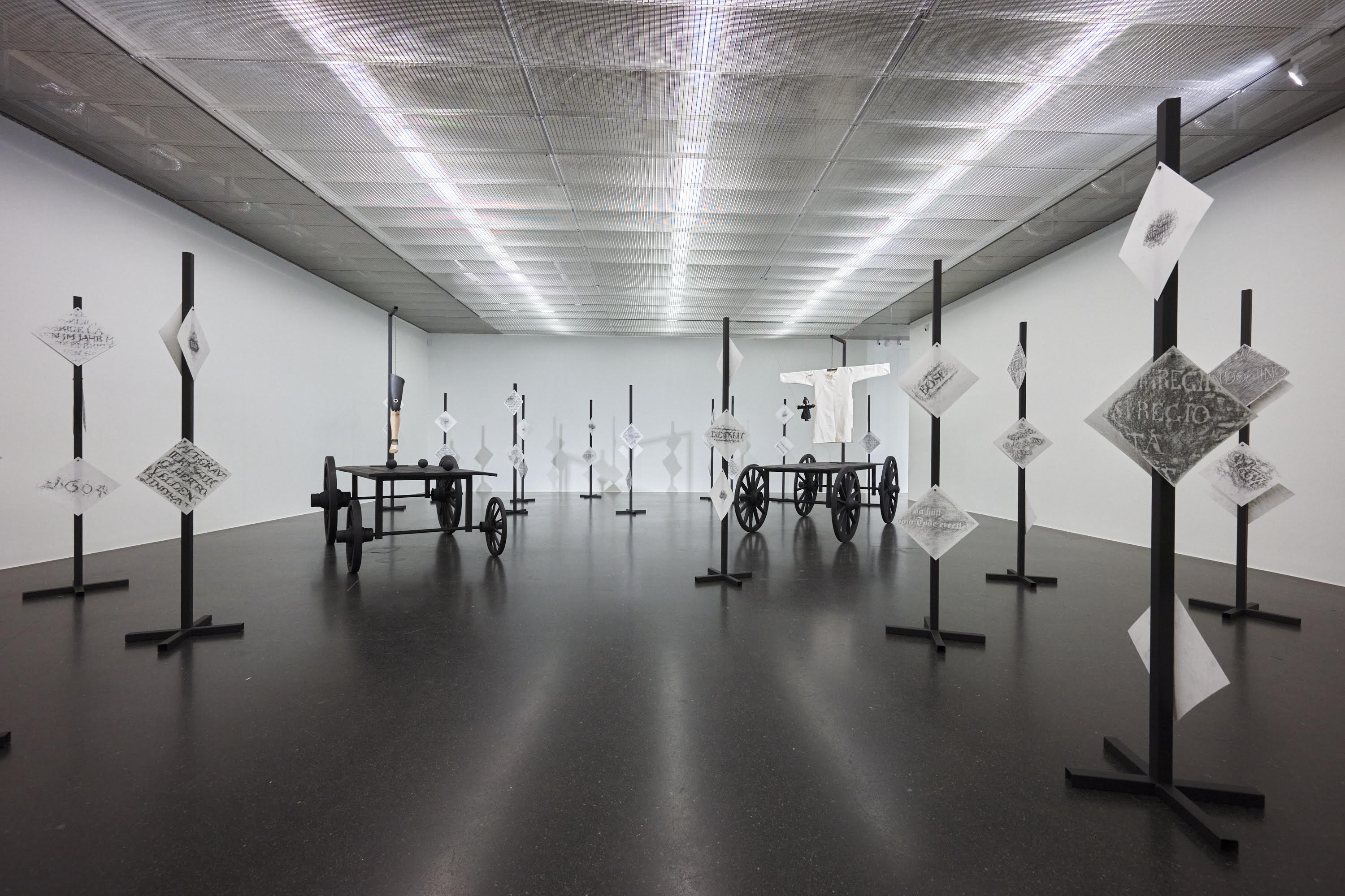 Ein zentraler Strang in Simon Wachsmuths jüngerer Arbeit ist seine langfristige Auseinandersetzung mit Krieg und Autoritarismus. Daraus ging eine Serie großformatiger Installationen in Form von Wagen und Bühnen hervor – quasi-theatrale Objekte, die untersuchen, wie frühneuzeitliche Konflikte wie der Dreißigjährige Krieg die moderne Diplomatie und die politische Architektur Europas geprägt haben und wie diese historischen Prägungen bis heute geopolitische Vorstellungen beeinflussen. Ausgangspunkt dieses Projekts war die Arbeit, für die er den Marta-Preis der Wemhöner Stiftung erhielt; seither hat es sich zu einem komplexen, mehrteiligen Forschungszyklus entwickelt. Wachsmuths Einzelausstellung Evil Spirits / Böse Geister im Lentos Museum in Linz (2025) präsentierte eine neue Gruppe von Installationen aus diesem Zusammenhang und verband historische Recherche mit gegenwärtigen Formen ideologischer und kultureller Projektion.