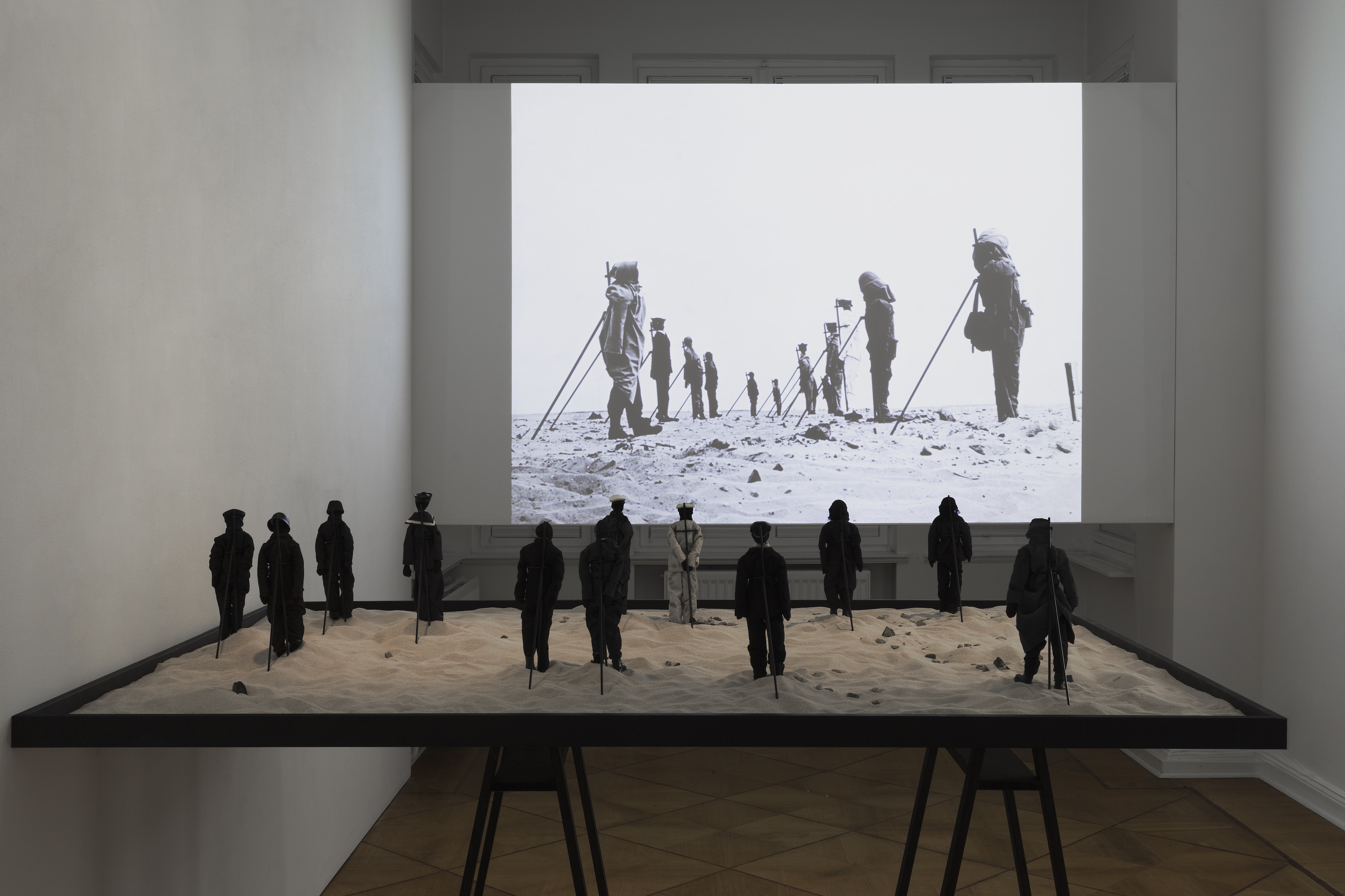 Amin’s newest work in the exhibition confronts France’s nuclear experiments in Algeria and the far-reaching impact of radioactive fallout. A haunting photograph from 1960 depicts two rows of human-like figures awaiting the detonation of an atomic bomb in the Algerian desert. Through a miniature model and live photo reconstruction of the original image, Atom Elegy (2022) captures the anticipation of nuclear violence pending in real-time. The catastrophic vision of nuclear destruction, a potent symbol of hubristic modernity, is both sublimated and foregrounded as a testimony to the colonial legacies of territorial destruction and, crucially, the neocolonial will to occupy the future.